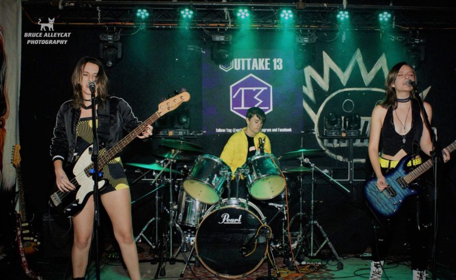 Outtake13 is a recently-formed alternative rock band based in Wilmington, North Carolina. The three-piece is comprised of identical twin sisters Michaela and Annabelle Sanchez, and Calen Barbour. Michaela plays acoustic guitar and bass, Annabelle plays electric guitar, and Calen plays drums. Both sisters sing the lovely vocal harmonies.