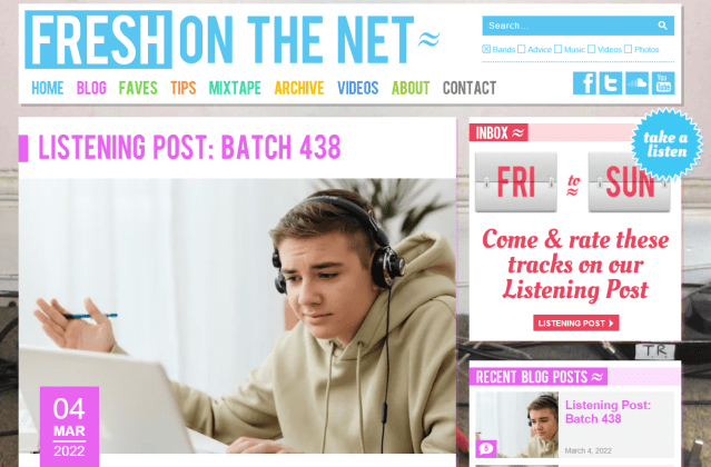 Each week, Fresh On the Net creates a new inbox, or “Batch” along with a successive number, for artists and bands to submit a song for consideration. The inbox opens Monday morning, and remains open until 200 songs are submitted or by Wednesday evening, whichever comes first. The entire inbox is posted on the site as a Soundcloud playlist, so that artists and music fans can listen to the submissions. The team of moderators listen to every single track, and each one chooses their five favorite songs, as well as any additional tracks they especially like. After the total scores are compiled, the top 25 tracks are published as a Listening Post on Friday morning. Anyone can vote for their five favorites from that list of 25 tracks. Those votes are compiled Sunday night into a Fresh Faves list of 10 tracks, which are then reviewed by one of the site’s moderators the following week.